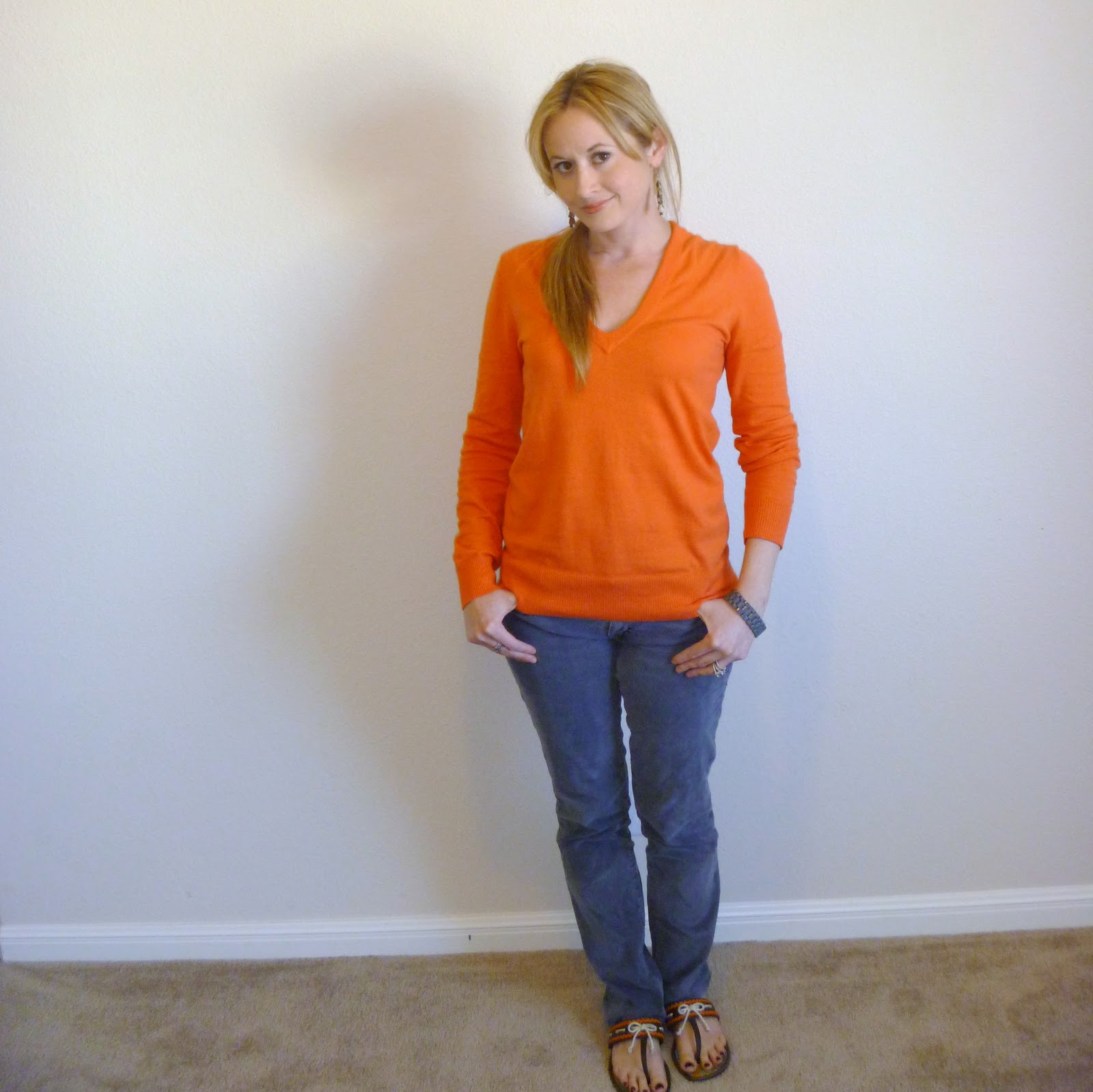 I wore this outfit today. Note the autumnal color palate, long sleeves, and corduroy pants, all of which are classic fall staples. However, since the mercury is still reaching into the 90’s in my neck of the woods I’m keeping cool with a pair of open flat sandals. Additionally, the sweater is a super light tissue weight cotton and I’ve pulled my mop back and off my face and neck to keep it breezy.